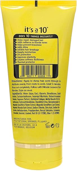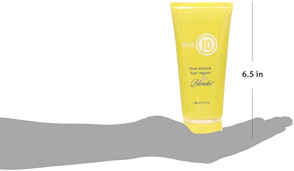 * it's a 10 Haircare Five Minute Hair Repair for Blondes, 5 fl. oz. (Pack of 3): repairs damaged blonde hair: formulated to repair damage and restore shine to blonde hair in just 5 minutes * Lightweight Formula: The lightweight formula absorbs quickly without weighing hair down * Salon Quality Results: Achieves salon quality results with a blend of ingredients like keratin and violet pigments * For All Hair Types: Suitable for all hair types and textures * Including color-treated and damaged