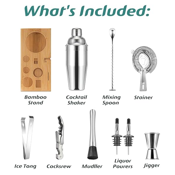 * Cocktail Shaker Set, Mixology Bartender Kit 10-Piece Bar Tool Set with Stylish Bamboo Stand, Bar kit: Matini Shaker Mixing Spoon Muddler Jigger Cocksrew for Barware Set: bartender kitprofessional cocktail shaker set includes bamboo stand * Drink shaker with a lid and filter thatll keep chunks and ice contained * A double size 1 / 0.5 oz measuring jigger * 10 inch cocktail muddler and mixing spoon * 2 liquor pours