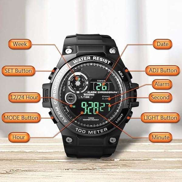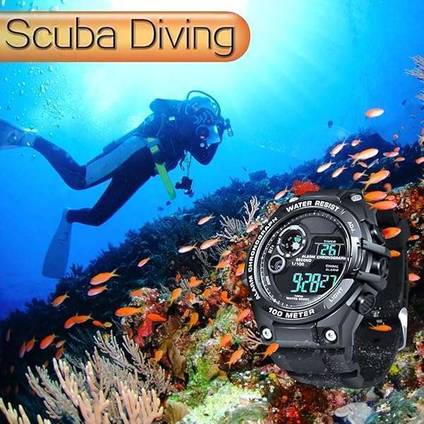 - TEKMAGIC 100m Underwater Scuba Diving Watch for Mens Boys with Stopwatch, Chronograph, Alarm Functions, Dual Time Zone, 12/24 Hours Format provides reliable performance and quality- It is a 10 atm water resistant grade, can work or be operated up to 100m underwater, suitable for swimming, snorkeling, scuba diving or other water activities.- This watch has chronograph, countdown, dual time zone, alarm clock and hourly chime functions.