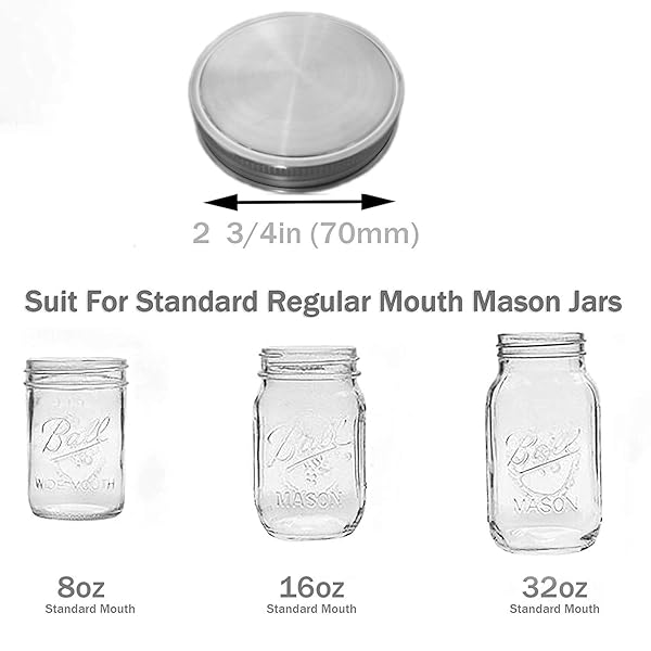 - Stainless Steel Mason Jar Lids,12 Pack Polished Surface,Reusable and Leak Proof,Storage Caps with Silicone Seals for Regular Mouth Size Jars (12-Pack Stainless Steel Lids(Regular Mouth)) offers reliable performance and quality- Regular Mouth Mason Jar Lids:Suitable for regular mouth mason jar .Such as jars 2 38 in (60 mm) inner and 2 34 in (70 mm) outer diameter