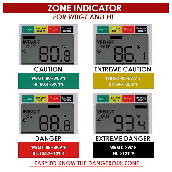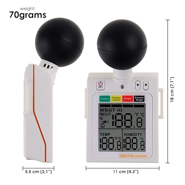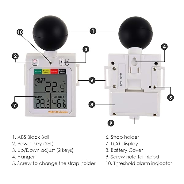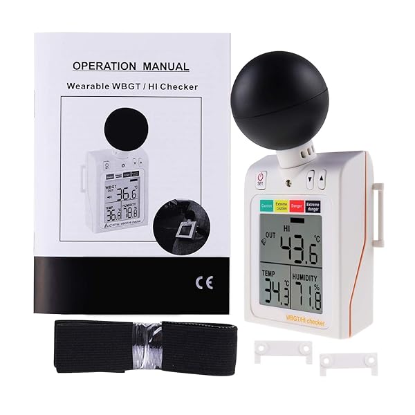 * Wearable 2-in-1 WBGT + HI Heat Index Checker Wet Bulb Globe Temperature Heat Stress Meter Air Globe Temperature Humidity Tester with Dangerous Level Indicator Audible Alarm: measures air temperature * Globe temperature * Humidity and heat stress index * Comes with arm strap and No buckles making it easy to monitor your outdoor activities * It can also be mounted in a tripod