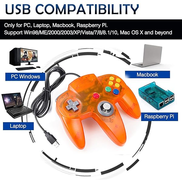 - 2 Pack USB Wired N64 Controller, miadore Classic N64 PC Gamepad Joystick Controller for Windows PC MAC Linux Raspberry Pi 3 (Green/Orange) with reliable performance and quality- Use the generic standard USB port, if your program or application accepts USB controller input, it can be used natively without drivers or patches, JUST PLUG AND PLAY!- Supported Operating system: Windows 98, ME, Vista, 2000, 2003, XP, 7, 8, 8.1, 10; Linux UBUNTU, Linux Mint, Android Linux (via an U
