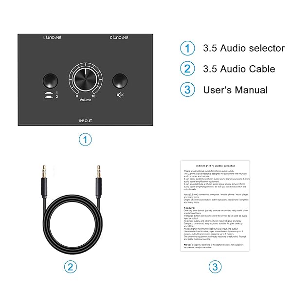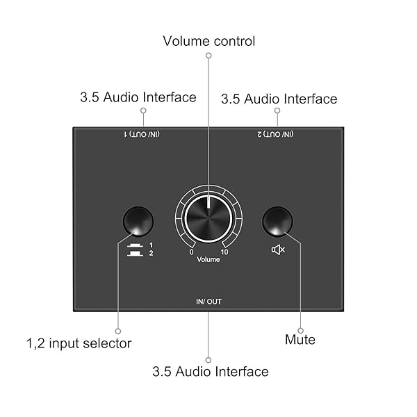 * 3.5mm Stereo Audio Switch Audio Switcher Passive Speaker Headphone Manual Selector Splitter Box Audio Sharing: 2-in-1-out mini 3.5mm audio selector designed for customers having several audio sources and outputs * Select audio input between 1 and 2 with 1/2 switcher and get one output * Select audio output between 1 and 2 to receive one input * One key to Mute * Very useful under special conditions