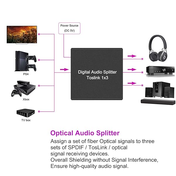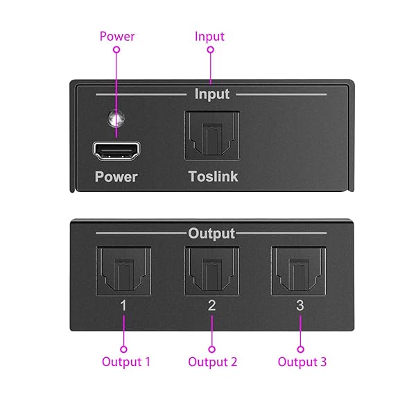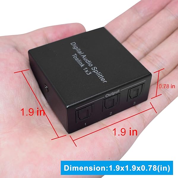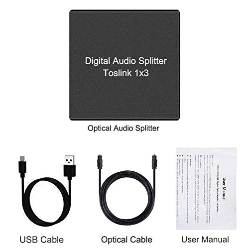 - Y.D.F 3 Port Toslink Splitter Audio Splitter 1 in 3 Out Digital Optical Audio Splitter Support LPCM 2.0 DTS Dolby Digital for PS4 DVD HDTV Blue-Ray Ect offers reliable performance and quality- Audio Splitter: One way of optical fiber signals splitter to three sets of SPDIF/TosLink/Optical signal receiving device;- Lossless Signal Transmission, Aluminum Alloy Design Overall Shielding without Ensure high-quality audio signal;
