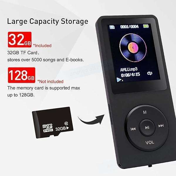 - MP3 Player 32GB with Speaker Earphone Portable HiFi Lossless Sound MP3 Mini Music Player Voice Recorder E-Book HD Screen 1.8 inch Black Support up to 128GB provides reliable performance and quality- 32GB Large StorageStores over 5,000 songs and books. You could enjoy all music you loved. Tip: The memory card has been inserted into the player when you receive it, in case of missing. You'd bette...