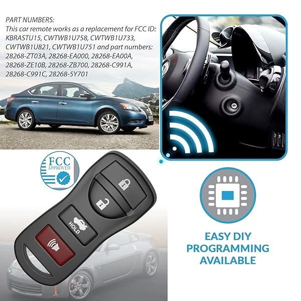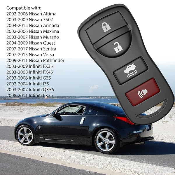 - 4 Button Car Keyless Entry Remote Key Fob Fits for Nissan 350Z Altima Armada Maxima Murano Pathfinder Sentra Versa Quest Infiniti QX56 EX35 FX35 FX45 G35 FCC ID: KBRASTU15, CWTWB1U733 (Pack of 2) with reliable performance and quality- CompatibilityNew key fob fits for Nissan: 2003-2009 350Z, 2002-2006 Altima, 2004-2015 Armada, 2002-2006 Maxima, 2003-2007 Murano, 2009-2011 Pathfinder, 2007-2017 Sentra, 2007-2015 Versa, 2004-2009 Quest. Infiniti: 2008-2011 EX35, 2003-2009 FX35, 2003