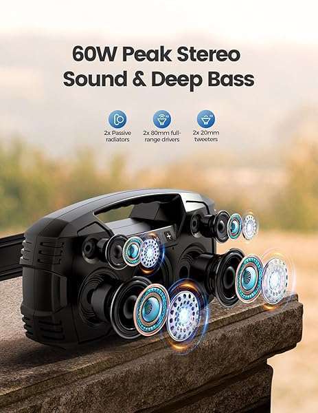 - Portable Wireless Bluetooth Speaker, 40W (60W Peak) Loud Sound IPX7 Waterproof Speakers, 32H Playtime, Outdoor Speaker, Rich Bass, BT 5.0, TWS Pairing, Built-in Mic, for Party, Pool, Beach, Gifts p...- SUPER LOUD STEREO SOUND: This 40W portable Bluetooth speaker features 2 tweeters and 2 full-range drivers to stream up to 60W loud and clear sound to your home or outdoor parties. 2 additional pass...