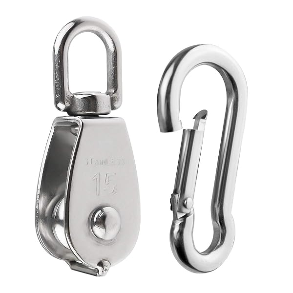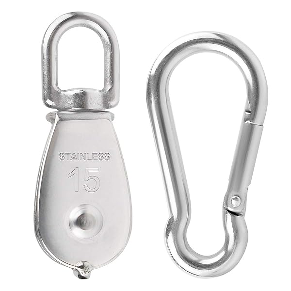 - 5Pcs 304 Stainless Steel M15 Single Pulley Block, Wire Rope Hanging Wire Towing Wheel, with 5Pcs Spring Snap Hook offers reliable performance and quality- Material: 304 stainless steel, anti-rust and wear-resistance with strong structure- M15 Single Pulley Block Overall Size: 58 * 21mm / 2.3 * 0.83in (length * width), Max Load: 80 lbs- 360 degree rotation to prevent knotting of the rope, easy to use