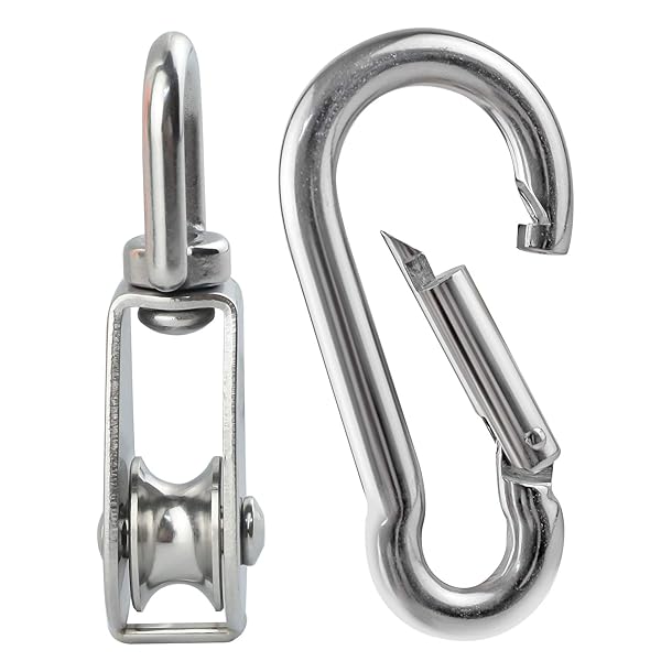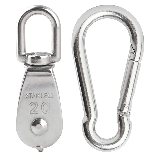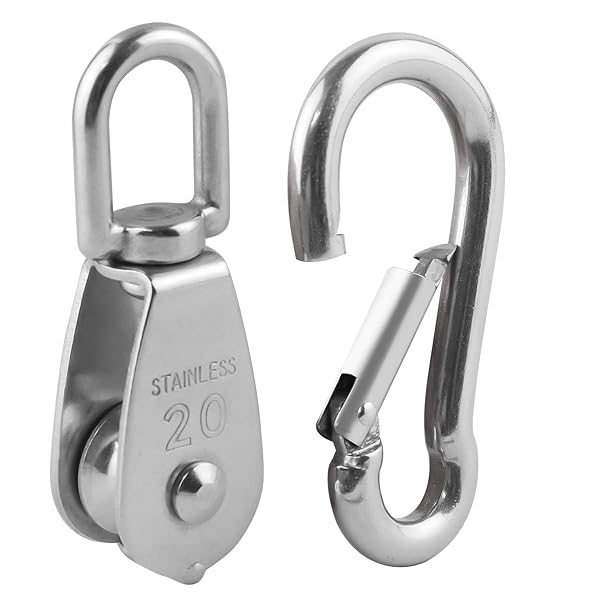 - 5Pcs 304 Stainless Steel M20 Single Pulley Block, Wire Rope Hanging Wire Towing Wheel, with 5Pcs Spring Snap Hook offers reliable performance and quality- Premium Quality - Made from 304 stainless steel makes it sturdy, both the sliding pulley and the carabiners are rust-proof and can hold around 165 pounds of force, heavy duty strong structure. Designed for hanging weight things to lighten load