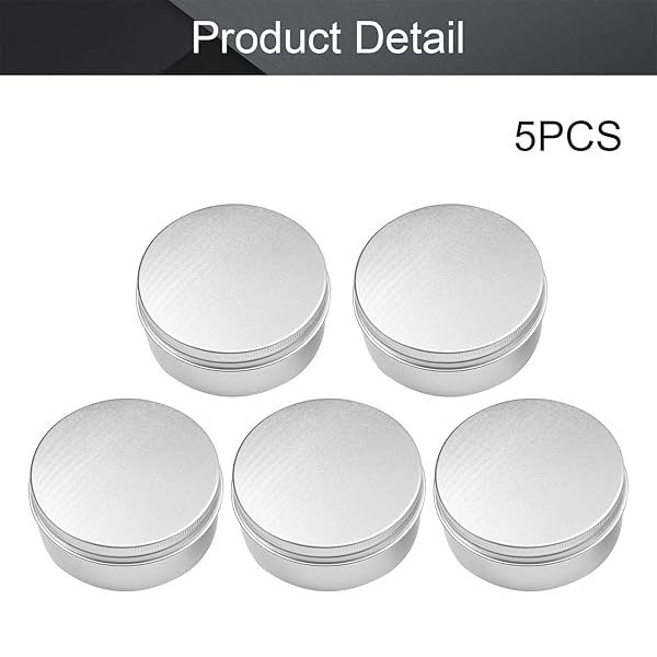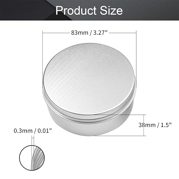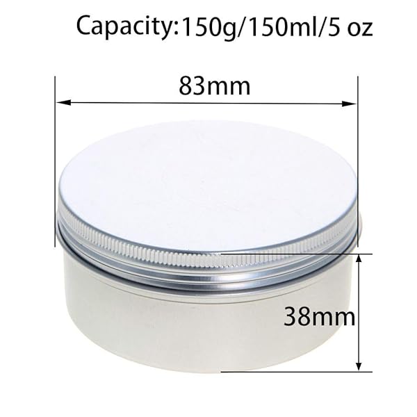 - Othmro 5pcs 5.1oz Metal Round Tins Aluminum Tin Cans Containers with Screw Lid, 83 * 38mm(DxH) Silver tin cans for Salve, Spices, Lip Balm, Tea or Candies 150ml offers reliable performance and quality- BASIC INFORMATIONCapacity: 150g/150ml/5 oz; Dimensions: 83380.3mm (DxHxT); Material: Aluminum Alloy- HIGH QUALITYMade from Aluminum alloy, can be recycled or re-used making them really eco-friendly