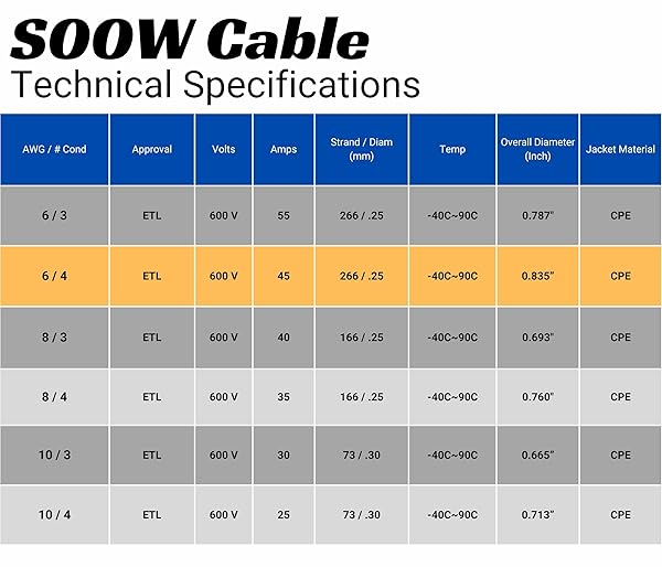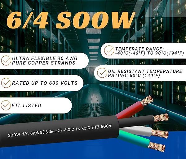 - 6 Gauge 4 Conductor 6/4 AWG Black SOOW Portable Power Cable Wire (10 Feet) with reliable performance and quality- DURABLE CONSTRUCTION: Heavy-duty 6 AWG copper conductors withstand high heat and current loads for demanding industrial applications. Offers maximum protection even in extreme temperatures or harsh conditions. Insulation resistant to abrasion, battery acid, diesel fuel, engine coolant, engine oil, ethanol, extreme temperatures, flame, gasoline, power-steering fluid, tr