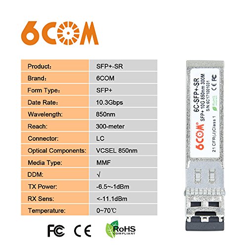 - 6COM 10GBase-SR SFP+ Transceiver, 10G 850nm LC Multi-Mode Module, up to 300 Meters, for Cisco, Ubiquiti, D-Link, Supermicro, Netgear, Mikrotik, ZTE and More offers reliable performance and quality- Strong Compatibility - for Cisco, Ubiquiti, D-Link, Supermicro, Netgear, Mikrotik, ZTE and More- 10GBase-SR SFP+ Module - 10G data rate, Multi-Mode, duplex LC connector, 850nm wavelength, up to 300m transmission distance