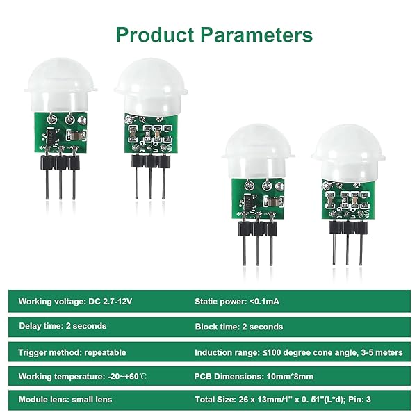 - 6PCS AM312 Mini Sensor Module Infrared Motion Automatic Detector DC 2.7 to 12V with 10pin Wire for Arduino with reliable performance and quality- Working Voltage:DC 2.7V-12V;Max Static current:1mA;delay time: 2S;Blockade time: 2S;Sensor angle:100 Degree;Sensor distance: 3-5m.- Repeatable Trigger Mode:When people enters the sensing range, the sensor can detect, so the automatic output high level. The sensor will continue to output a high level if the person does not leave th