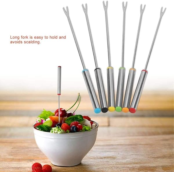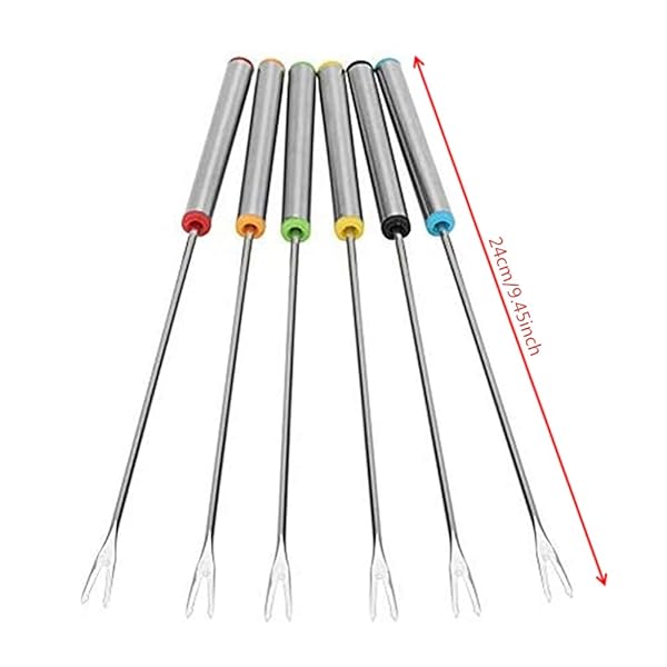 - 6-Piece Stainless Steel Fondue Sticks Set with Heat Resistant Handle for Cheese, Meat, Chocolate, Dessert, Roasting offers reliable performance and quality- Humanized Design : The total length of the hot pot fork is about 24cm/9.45 inches, the handle is made of PP, the texture is soft, heat insulation, and the hand feels comfortable