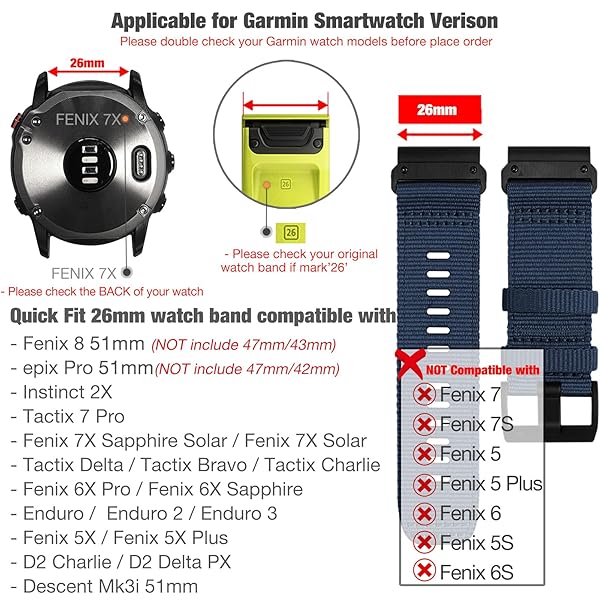 - Abanen Rugged Nylon Watch Bands for Garmin Fenix 8 51mm / Enduro/Instinct 2X / epix Pro 51mm, Adjustable Sports Wrist Strap with Stainless Steel Clasp for Fenix 7X / 6X /5X, Instinct 3 50mm with reliable performance and quality- Compatible ModelsQuickFit 26mm watch band Compatible with Garmin Fenix 8 51mm, epix Pro 51mm, Instinct 2X / Instinct 3 50mm, Tactix 8 51mm, Fenix 7X Sapphire Solar / Fenix 7X Solar, Tactix 7 Pro,Fenix 6X Pro / Fenix 6X Sapphire Solar ,Fenix 5X /5X Plus,D2