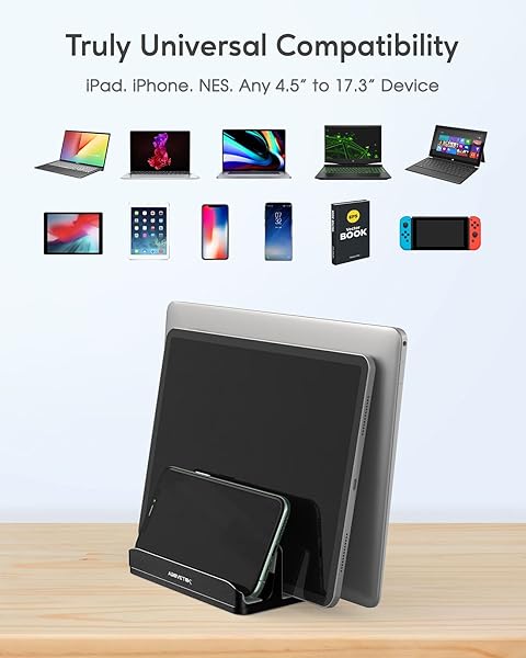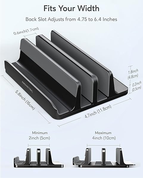 * AboveTEK Vertical Laptop Stand Holder, 3 Slots Aluminum Desk Stand with Adjustable Dock Size for Tablet, MacBook, Phone - Universal Fit (up to 17.3") - Heavy Duty Polished, Anti Slide - Black: 3-slot versatility: accommodates two laptops (up to 17.3") such as macbook * Surface * Gaming laptops * And notebooks * Plus one dock for phones like iPhone or Samsung