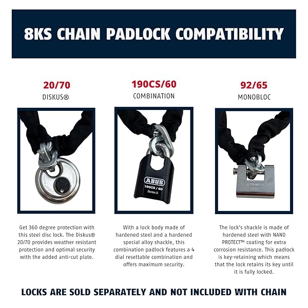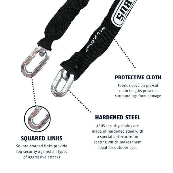 - ABUS Hardened Steel 8KS/16 Thick Square Security Chain for Bikes, Containers, Trailers, ATV's, Motorcycles and Personal/Industrial Property (2') provides reliable performance and quality- High Security Chain: This security chain offers optimum security against all types of aggressive attacks; Made of hardened steel with a special anti corrosion coating that makes them ideal for outd...