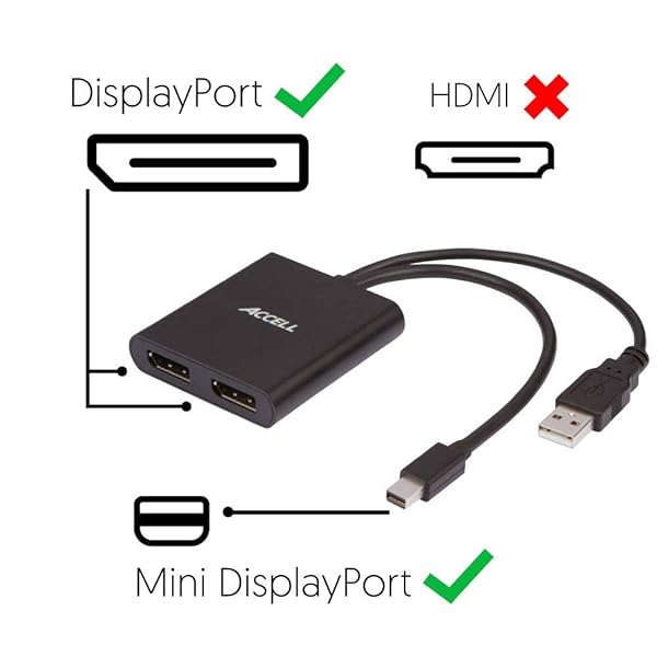 - Accell mDP-2DP Multi Monitor Splitter - Mini DisplayPort 1.2 Multi-Stream Transport (MST) Hub - 1x Mini DisplayPort connector, 2x DisplayPort outputs,Black offers reliable performance and quality- Dual HD Display: Extend your laptop with 2 extra monitors either in mirrors or extended mode using Multi-Stream Transport (MST) Protocol