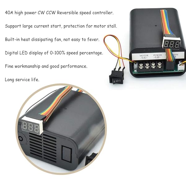 - Acxico 1Pcs PWM DC Brush Motor Speed Controller DC 10-55V 60A CW CCW Reversible Switch Digital LED Display Potentiometer Switch Built-in Brushless Fan offers reliable performance and quality- DC 10-55V MAX 60A CW CCW Reversible Switch PWM Brush Motor Speed Controller- Continuous current: 40A;Support large current start, protection for motor stall- Built-in heat dissipating fan, not easy to fever.Great for fast heat dissipation