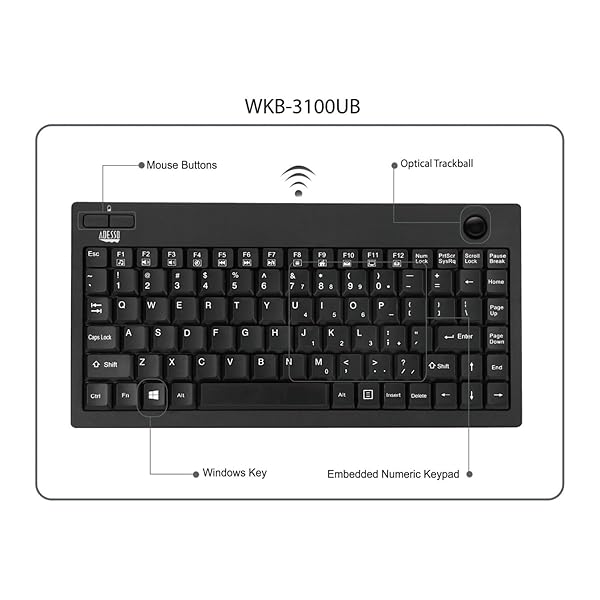- ADESSO WKB-3100UB Wireless Mini Trackball Keyboard - Compact 87-Key Layout, Built-in 800 DPI Optical Trackball, 24GHz RF Wireless Technology, USB Interface, 30-Foot Range: reliable performance and quality- Wireless Freedom: Enjoy up to 30 feet of wireless- Integrated Trackball: Built-in 800 DPI optical- Compact Design: 87-key layout with embedded numeric- Durable & Reliable: Membrane switch type with a
