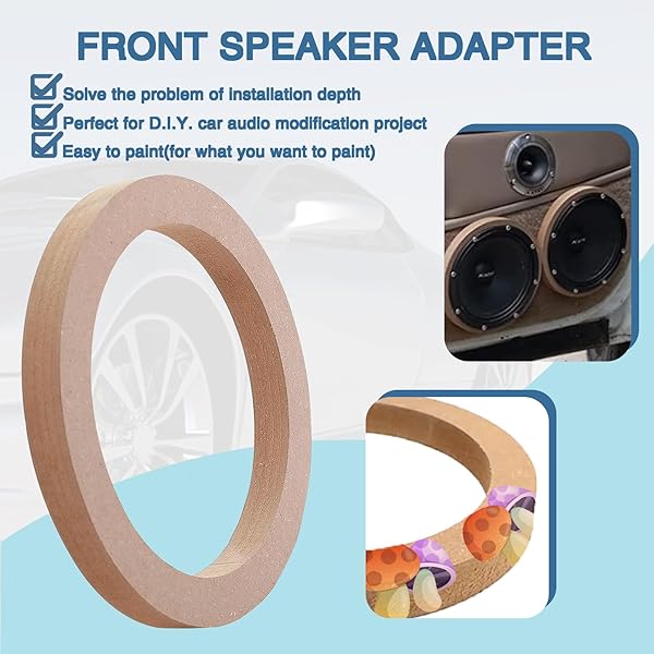 - AICARS Universal 6.5 Speaker Spacer: 26.5 Wooden MDF Rings for Cars/Boats/Trucks/RV: reliable performance and quality- PACKAGE-Comes with 2 Pcs x 6.5 Speaker Spacers- MATERIAL-Made of high quality and firm MDF wood to make sure long lifespan- DIMENSION-Outer diameter is about 7.3"(185.5mm),the speaker ring will fit most 6.5"- APPLICATION-Widely used in Cars, Boats, Trucks, RV, and etc,could be DIY painted for what