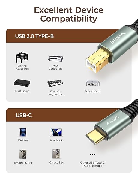 - AINOPE USB B to USB C CableHigh Speed USB C to USB B Printer Cable for MacBook Pro/Air, MIDI Cord for Yamaha Casio Digital Piano, MIDI Keyboard, DJ Controller, DAC to iPad,6.6ft/Grey provides relia...- Wide Device Compatibility: Connect USB-B devices (printers: HP, Brother, Epson; scanners, Yamaha digital pianos, MIDI keyboards, DJ controllers) directly to USB-C phoneslike iPhone 16 15, Samsung, ...