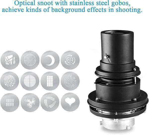 - Alluneitter Bowens Mount Snoot,Strobe Video Snoot Conical Projector snoot with Optical Lens kit Include Various Gobos Used for Video Artist Modelling Shape Light Studio Photography Projection provi...- [CASUAL CREATION ]:Gobos and color gel could be used together,also could use alone to achieve special light effects.Providing more abundant resources for creative shooting.
