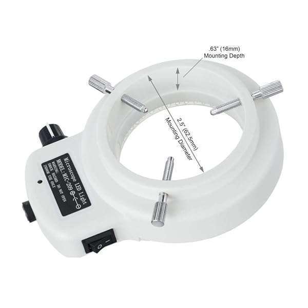 - AmScope LED-144W-ZK White Adjustable 144 LED Ring Light Illuminator for Stereo Microscope & Camera provides reliable performance and quality- Provides intense and focused shadow-free illumination- 2.5" (62. 5mm) inside and 3. 64" (92. 5mm) overall outside diameters- Power input: 110-240V, 50-60HZ, auto switching- 1-7/8" (48 mm in diameter) ring adapter included
