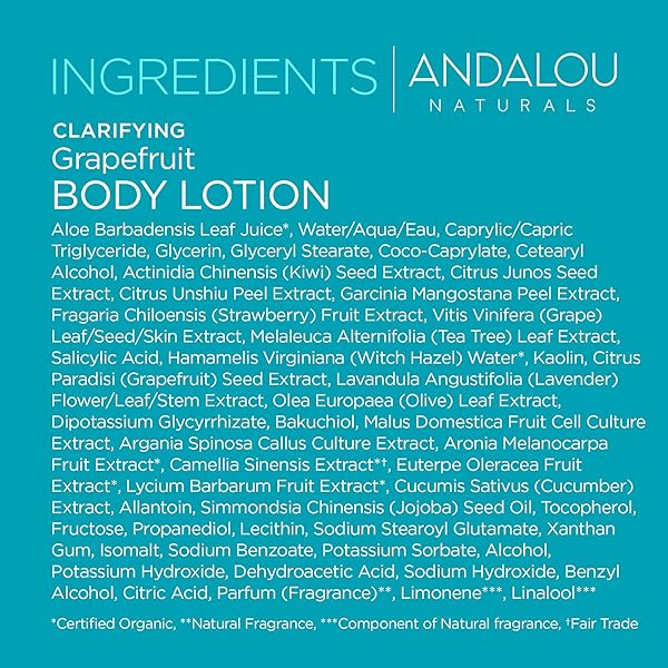 * Andalou Naturals Body Lotion, Clarifying Grapefruit Skin Care, Lightweight, Gentle Exfoliating & Moisturizing Lotion with Salicylic Acid & Tea Tree for Skin Prone to Back Acne & Blemishes, 8 fl oz: andalou naturals clarifying grapefruit body lotion elevate your skincare routine and reveal your skin's true radiance with our clarifying body lotion * Enriched with the invigorating essence of Grapefruit * Your skin is treated to a burst of refreshing vitality * This innovative salicylic acid