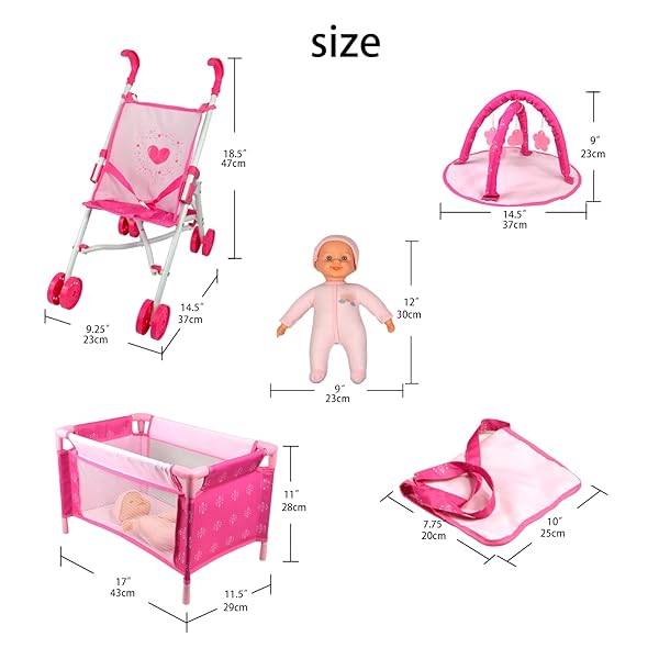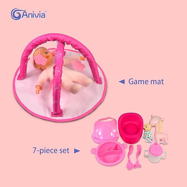 - ANIVIA Baby Doll Stroller Set - Includes Stroller, Crib, Play Mat, Feeding Toy, Diaper Bag - Nursery Role Play Set (11" Doll Included) with reliable performance and quality- Gift Package Contains1x 11'' doll, 1x baby stroller, 1x play mat, 1x doll bed,1x travel bag and a variety of feeding accessories.- Benefits: This doll accessories set not only help your child create their own fun and use their own dolls, but also help them to develop their hand-eye coordination and crea