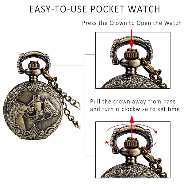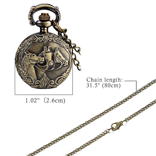 - JewelryWe Antique Horses Locket Quartz Pocket Watch Full Hunter Sweater Necklace offers reliable performance and quality- STYLISH - Horse pattern on the watch case, so cute and unique. it symbolizes success and smooth. Delicate carve pattern bronze back, retro and vintage- HIGH QUALITY - Premium quartz movement makes the watch a precise time keeper. Alloy watch case and chain. Clear dial with hands and numerals