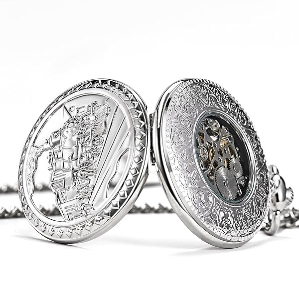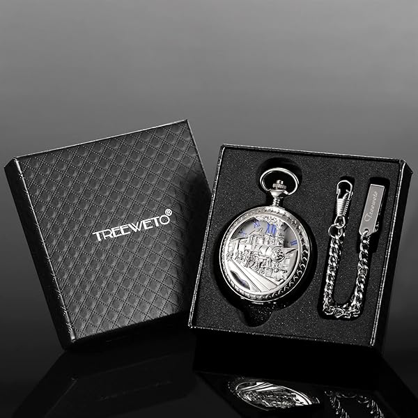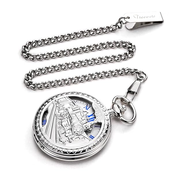 - TREEWETO Mens Womens Antique Mechanical Pocket Watch Skeleton Silver Case Steam Train Railroad Roman Numerals offers reliable performance and quality- SPECIAL DESIGN - Design with 3D Steam Train Railroad pattern hollow silver case, half hunter, blue roman numerals white dial, retro designed pocket watch can bring your memory back to 18th, fashionable and attractive! Fluorescent pointers, allow to read the times in dimly environment
