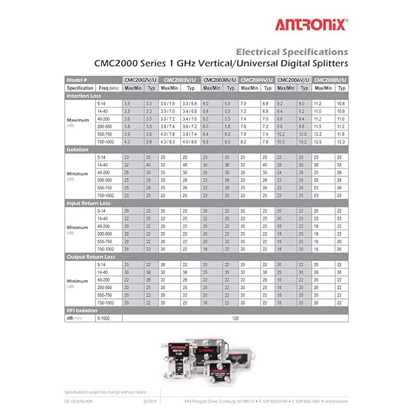 - Antronix 6-way RG6 Splitter Coaxial Signal CMC2006V Cable HDTV 1GHz 1002MHz offers reliable performance and quality- Capacitively Coupled F-ports protect against core re-magnetization and saturation while blocking AC surges- Zinc Alloy Diecast Housing and Backplate w/Proprietary Nickel Alloy Plating, superior corrosion resistant plating combined with a diecast backplate protects the back of the housing where corrosion is more prominent