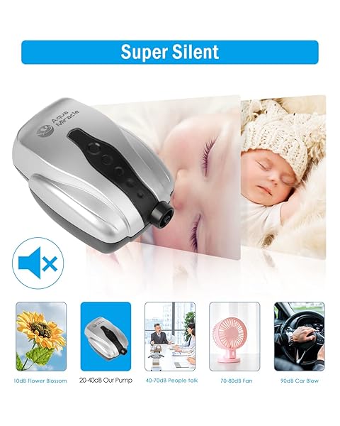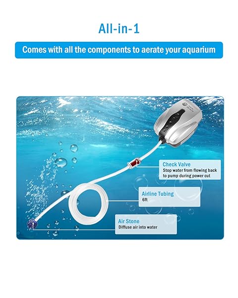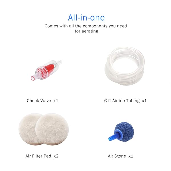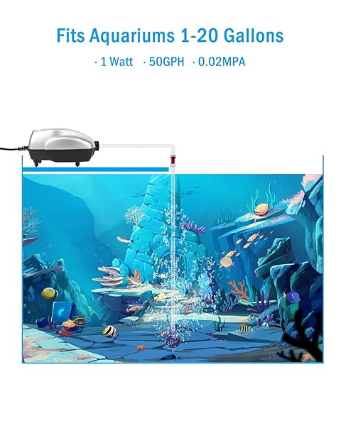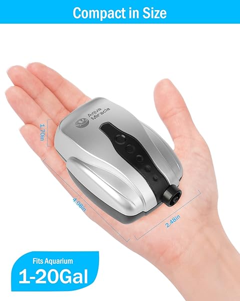 - AquaMiracle Aquarium Air Pump Fish Tank Bubbler Aerator, All-in-One Fish Tank Air Pump Kit, Quiet Small Aquarium Bubbler for 1-20 Gallon Aquariums offers reliable performance and quality- PERFORMANCE Although compact in size, this small aquarium air pump is energy efficient with powerful air output. Power 1Watt, Flow rate 50GPH, Air Pressure 0.02MPa. This air bubbler comes with 1 air outlet and fits fish tank size of 1-20 gallons