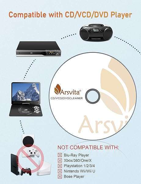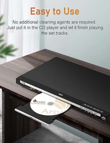 * Arsvita CD Laser Lens Cleaner Disc Cleaning Set for CD/VCD/DVD Player, Safe and Effective: why to uselaser lens cleaner for cd/vcd/dvd players experiencing slow loading * Skipping or freezing of discs during playback * Special TechnologyThe 2-brush clean process removes dirt and dust deposits that cause audio and video dropouts and distortions * Usage EffectCleaning the laser lens can extend the service life of CD / VCD / DVD player * And improve the sound and image quality at the same time