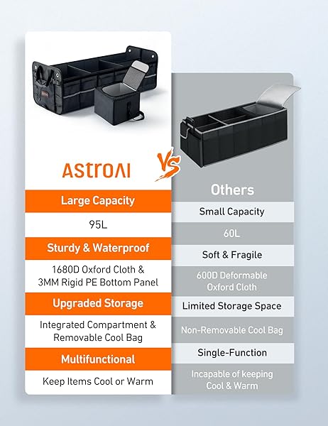 - AstroAI Car Trunk Organizer Storage Large for SUV, Truck, Pickup, Collapsible Trunk Organizer Portable Storage Box with Cooler Bag, Foldable Cover, Nylon Handles, PU Bottom and PE Plate offers reliable performance and quality