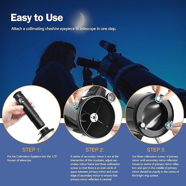 - Astromania 1.25Inch Metal Collimating Cheshire Eyepiece Without Laser for Newtonian Reflector Telescope - Long Version offers reliable performance and quality- Fits in 1.25 inch focusers and easy to use; simply cap the telescope; remove the diagonal and place the eyepiece directly in the focuser- For aligning optics of Newtonian reflectors; dobsonian reflectors and Schmidt-Cassegrain Telescopes; PS: Long Version is used for all newton telescopes