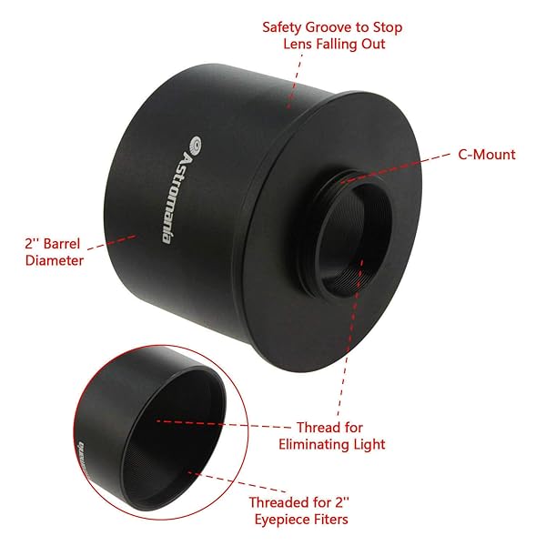 - Astromania C Mount to 2" Video Camera Barrel Adapter Telescope Astrophotography offers reliable performance and quality- The telescope adapter has a diameter of 2 inches for insertion in place of a 2 inch telescope eyepiece; allows the camera to be put into standard 2" eyepiece holders- The opposite end of this adapter has a C-Mount "1 inch diameter with 32 threads per inch" standard for all "C" inama photography movie cameras