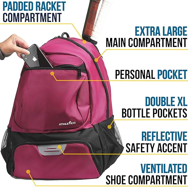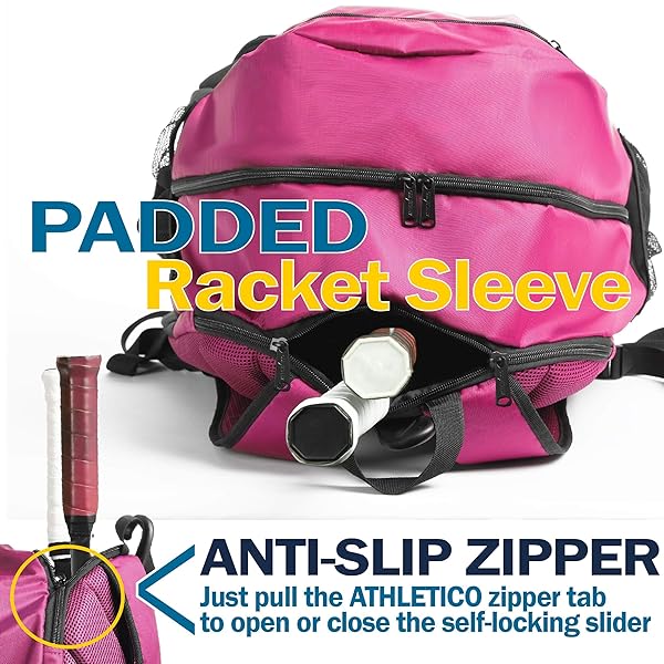- Athletico Premier Tennis Backpack - Tennis Bag Holds 2 Rackets in Padded Compartment | Separate Ventilated Shoe Compartment | Tennis Bags for Men or Women (Pink) offers reliable performance and quality- PADDED RACKET COMPARTMENT - fits two rackets (super oversized through junior size); top loading with double anti-slip zippers that stay in place to secure rackets -- alternatively a protective laptop sleeve