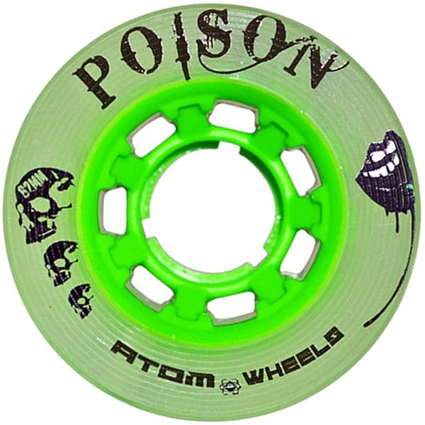 - Atom Skates Poison Wheels Indoor/Outdoor/Slick Surfaces 62x38 Green / 4 Wheels provides reliable performance and quality- 1 pack - 4 wheels / 62mm x 38mm / Color: Green- Hardness: HYBRID; Surfaces: Indoor/Outdoor, Slick Surfaces; Technology: Solid Core Technology- High performance for daily use- Built to last with durable materials