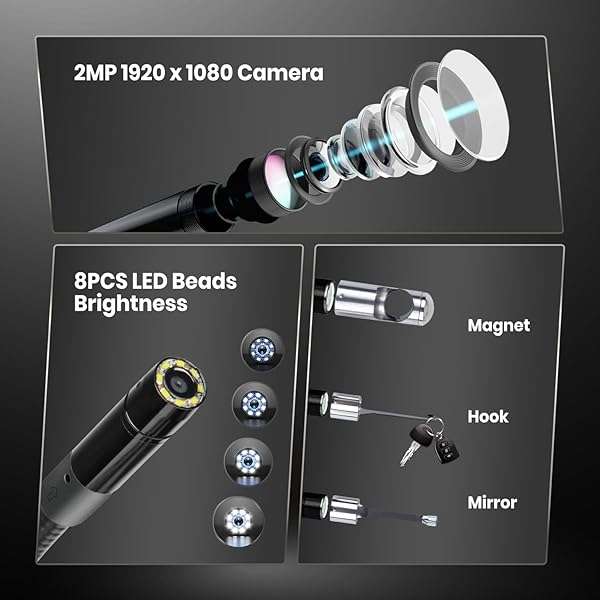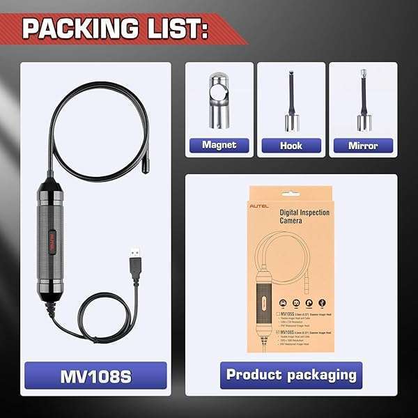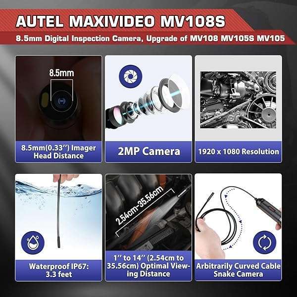 * 2025 Autel MaxiVideo MV108S Digital Inspection Camera, 2MP 1920x1080, IP67 Waterproof USB Endoscope, 8.5mm Borescope Snake Camera, 39.37'', LED Light, Work with Autel Scanner & P.C, Up of MV108 MV105S: 1920 x 1080 * 2MP CAMERA * 8.5MM DIAMETER IMAGER HEAD * CRYSTAL-CLEAR IMAGESUpgrade of MV108 * The head of Autel MV108S digital endoscope camera is 8.5mm diameter which enables it to reach smaller pipes and narrow areas