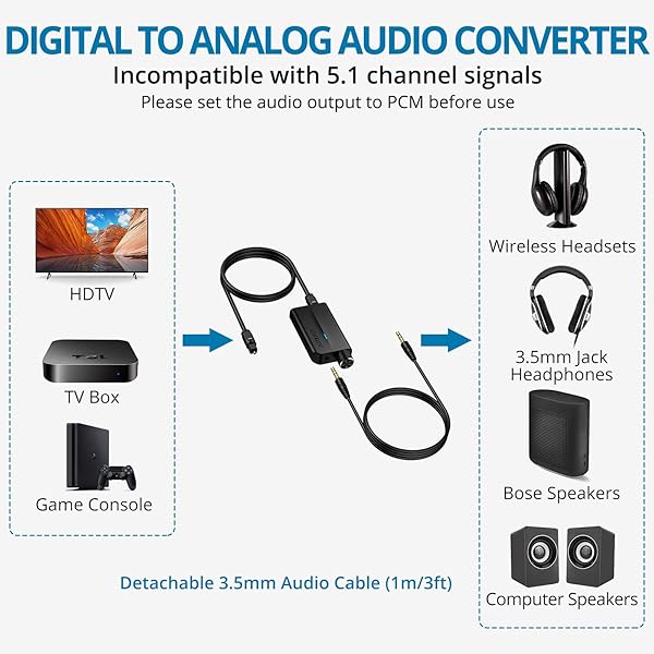 - AUTOUTLET 192kHz DAC Optical to 3.5mm Converter with Volume Control, Digital to Analog Audio Converter, Optical to Aux Adapter Built-in Amplifier Chip Suitable for HDTVs, DVD, Set-top Boxes with reliable performance and quality- Optical to 3.5mm Converter Digital to analog converter converts optical toslink digital audio signals to 3.5mm analog audio signals with no transmission loss for better sound quality reproduction.- NotePlease set audio output to PCM mode before use(