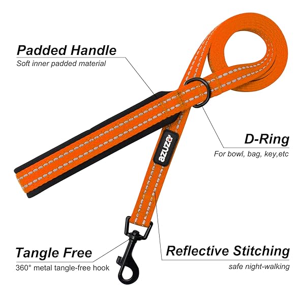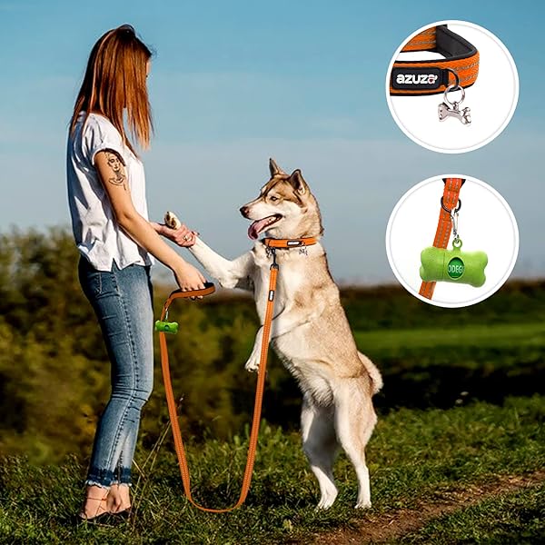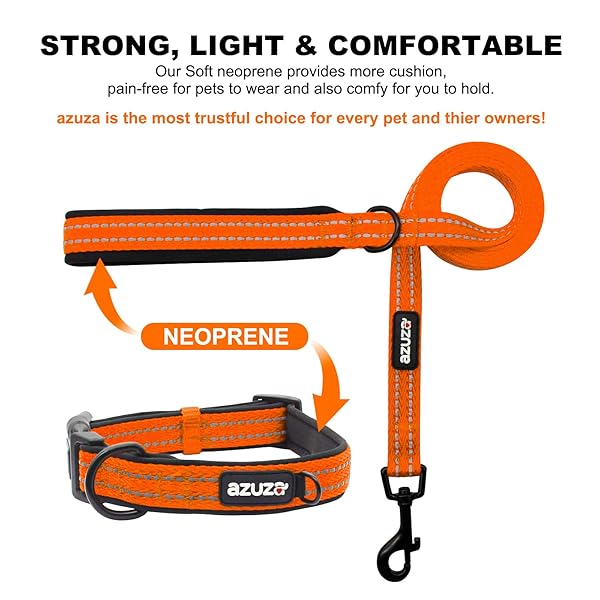 - azuza Durable Padded Dog Leash and Collar Set,Reflective Strip Extra Safe and Comfy for Medium Dogs, Orange offers reliable performance and quality- Size Small - Width 5/8". Neck 12"-16". Leash Length 6ft. Please make sure leave 2 fingers between the collar and dogs neck- Padded collar and leash set - Neoprene Liner is super soft for dogs, and comfy for you to hold. Water-resistant, good for outdoor walking;