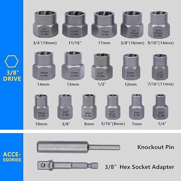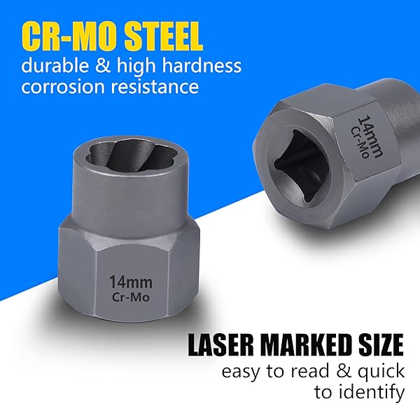 - B BOSI TOOLS Impact Bolt & Nut Remover Set, 18 Pieces Bolt Extractor Tool Set, Stripped Lug Nut Remover, Extraction Socket Set for Removing Damaged, Frozen, Rusted, Rounded-Off Bolts, Nuts & Screws offers reliable performance and quality- [CR-MO & Durable] The bolt nut remover is made of 60HRC high hardness chromium-molybdenum steel. The surface is coated with corrosion-resistant manganese phosphate for excellent rust-proof, impact resistance, durability and longevity