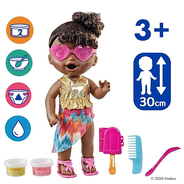 * Baby Alive Sunshine Snacks Doll, Eats and Poops, Summer-Themed Waterplay Baby Doll, Ice Pop Mold, Toy for Kids Ages 3 and Up, Black Hair: it's the first baby alive doll to feature both feeding and waterplay! with the included solid reusable doll food * Ice pop mold and stick * Kids can make ice pop shapes to feed Baby Alive Sunshine Snacks doll! The click-change diaper flap also makes changing-time a breeze for this baby doll that eats and "poops." Simply pop open the plastic-molded diaper's