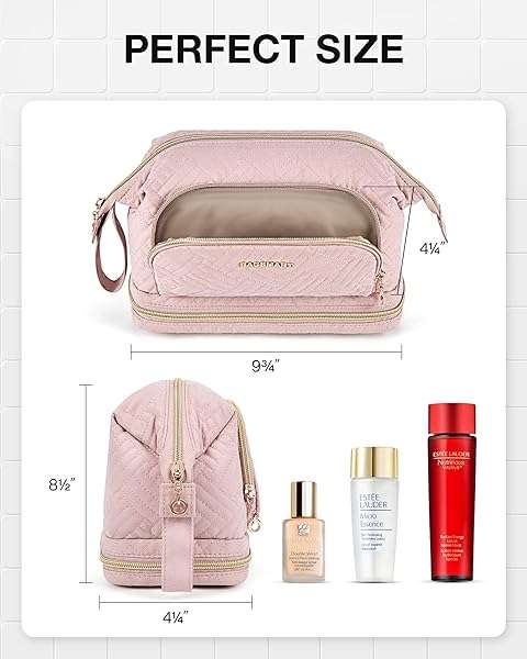 - BAGSMART Travel Makeup Bag, Cosmetic Bag Make Up Organizer Case, Dorm Room Essentials Large Wide-open Pouch Women Travel Essentials Double Layers Purse for Toiletries Accessories Brushes Pink: reliable performance and quality- Wide-open design with mesh pockets for easy access to- Bottom section has 8 elastic loops to protect makeup- Front pocket and second layer have PVC lining to keep- Roomy 9.75 x 8.5 x 4.25 in. capacity holds full-sized