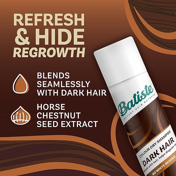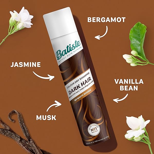 * Batiste Dry Shampoo for Dark Hair, 3.81 oz: take your hair from flat to fab with batiste divine dark dry shampoo * Our waterless formula targets excess oil * Dirt * And grease at the roots * Batiste Divine Dark is formulated with a hint of color so you can say goodbye to white residue and hello to a dry shampoo that blends seamlessly with your dark hair