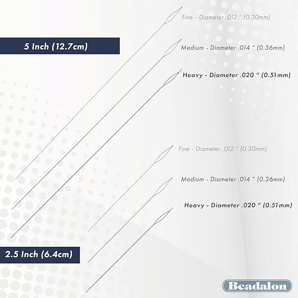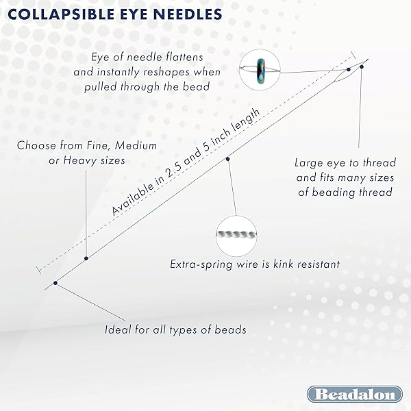 - Beadalon Collapsible Eye Beading Needles, Medium 0.36 mm / .014 inches diameter, 2.5 inches Length, 4 pc provides reliable performance and quality- Versatile Sizing: Our collapsible big eye beading needles come in fine, medium, heavy, and assorted sizes, and lengths of 5" and 2.5". These hand sewing needles are perfect for various projects.