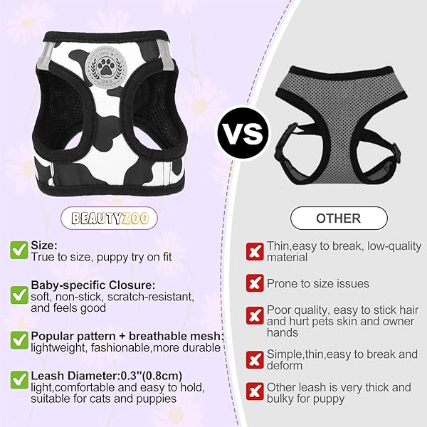 - BEAUTYZOO Small Dog Harness and Leash Set, Cow Print Step in Dog Harness No Pull No Choke Puppy Harness Reflective for XXS XS S Dogs Cats, Soft Padded Mesh Vest Harnesses Girl and Boy Pets offers reliable performance and quality