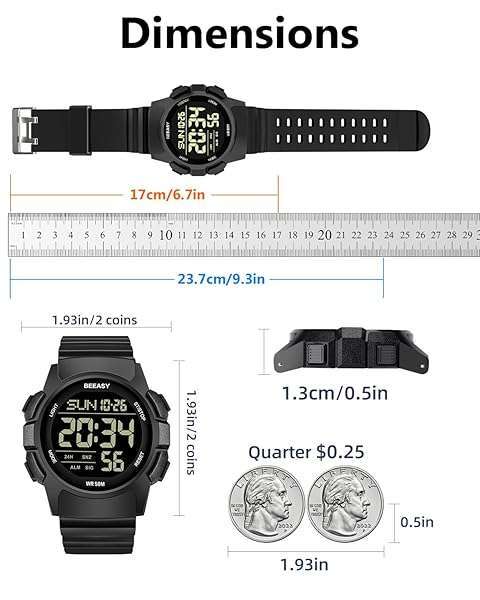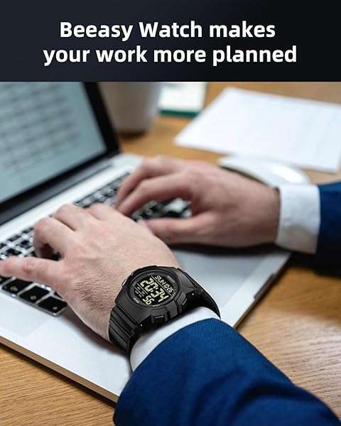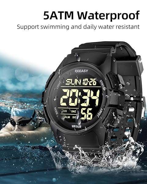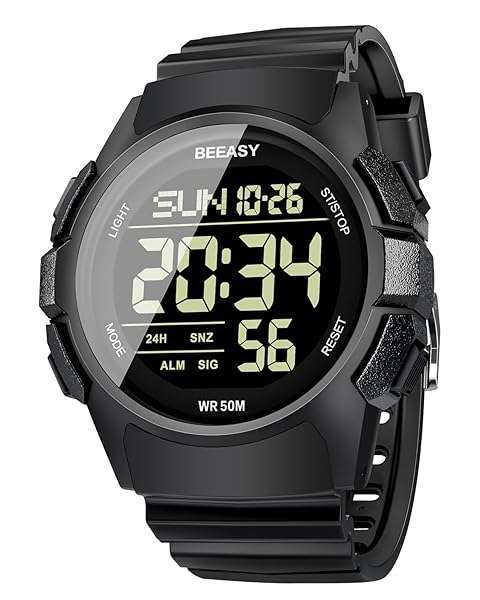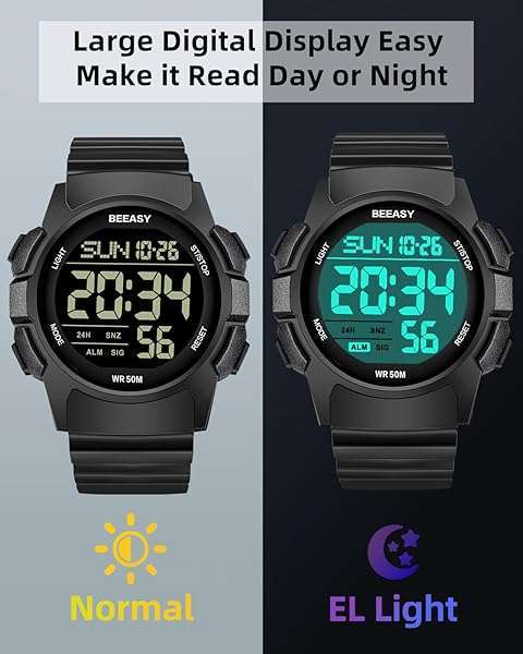 - Beeasy Men's Digital Watch with Ultra-clear Display, Waterproof, Shock-resistant, Multi-function Alarm, 5ATM offers reliable performance and quality- Digital Watch with Ultra-clear DisplayUsing the imported EL backlit screen, the time can be clearly displayed in the backlight.The mens digital watch also has 12/24H,dual time, stopwatch, countdown, halfway timing functions